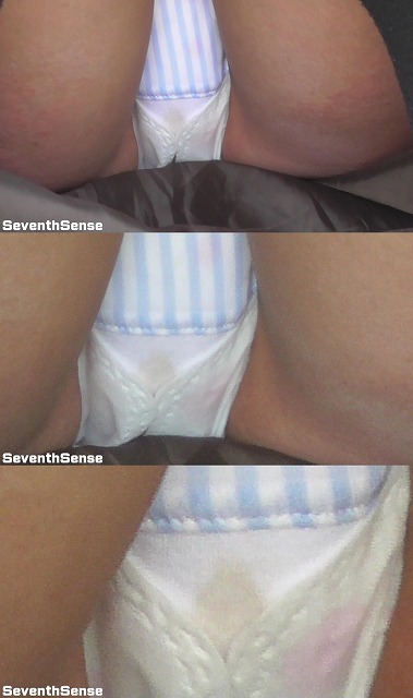 しかも白と青の縦ストライプというちょっと珍しめ(普通は横ストライプのような)の下着に、染みまでつけているというなかなか会心の作ですね。