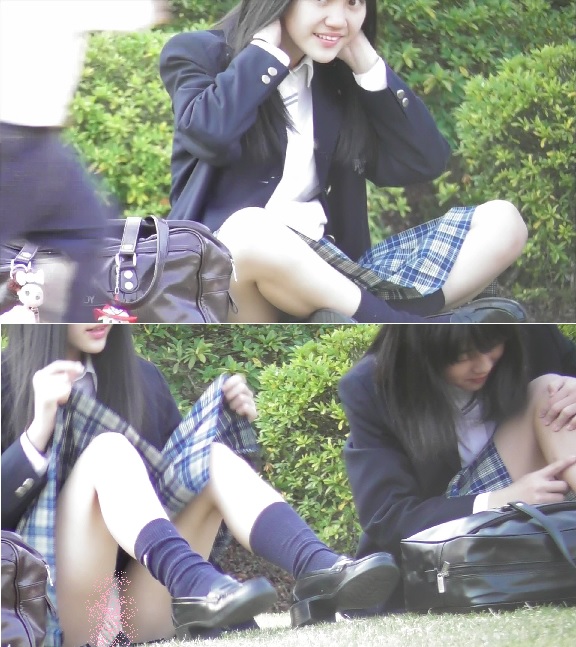 動画を再生すると、座っている制服女子がいるところから再生されます。野外で原っぱの上に座っています。