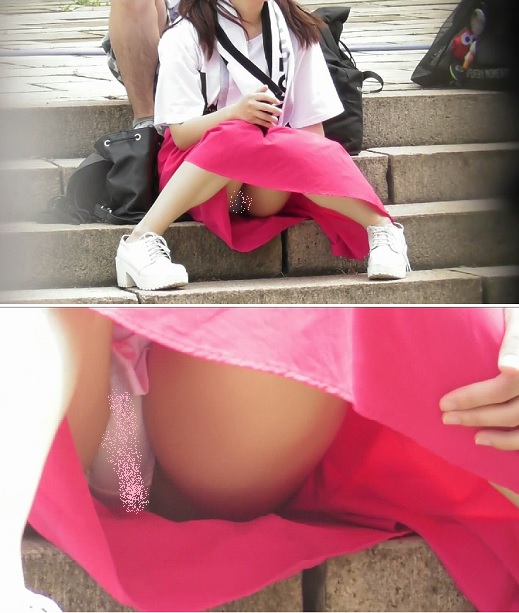段差に座ったため、白系のパンツがチラチラ見えています。