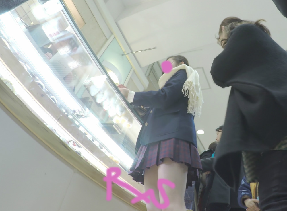 圧巻なのは1分すぎてからのところで、ターゲットの制服女子ちゃんが立ち止まっているところを斜め前から撮るんですが、スカートの中がパンツだけじゃなく、パンツの上のお腹まで見えちゃってます。