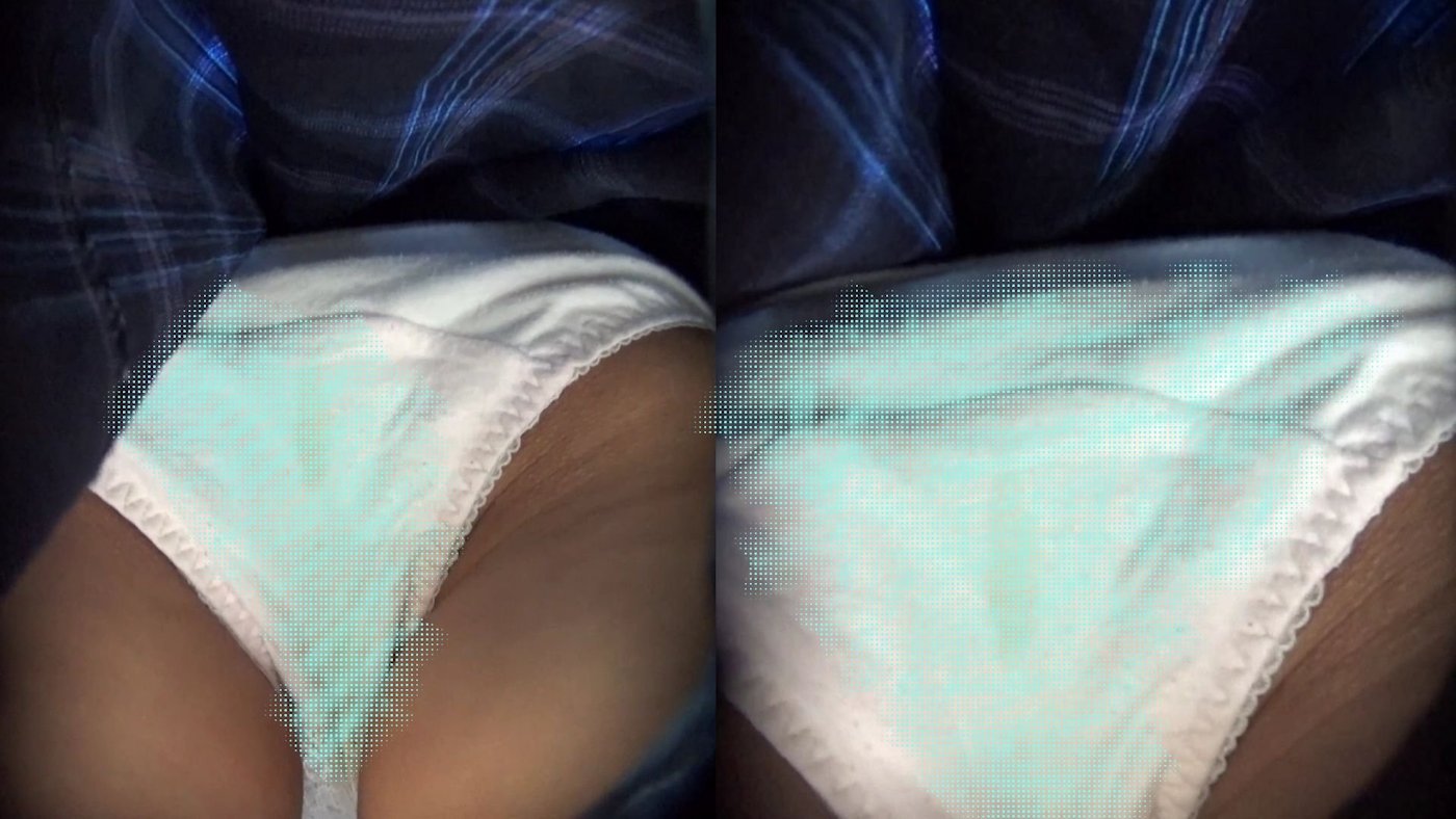 顔撮りの後、開始6秒のところから電車の中のシーンに切り替わって早速ローアングルでのパンツが見えます。