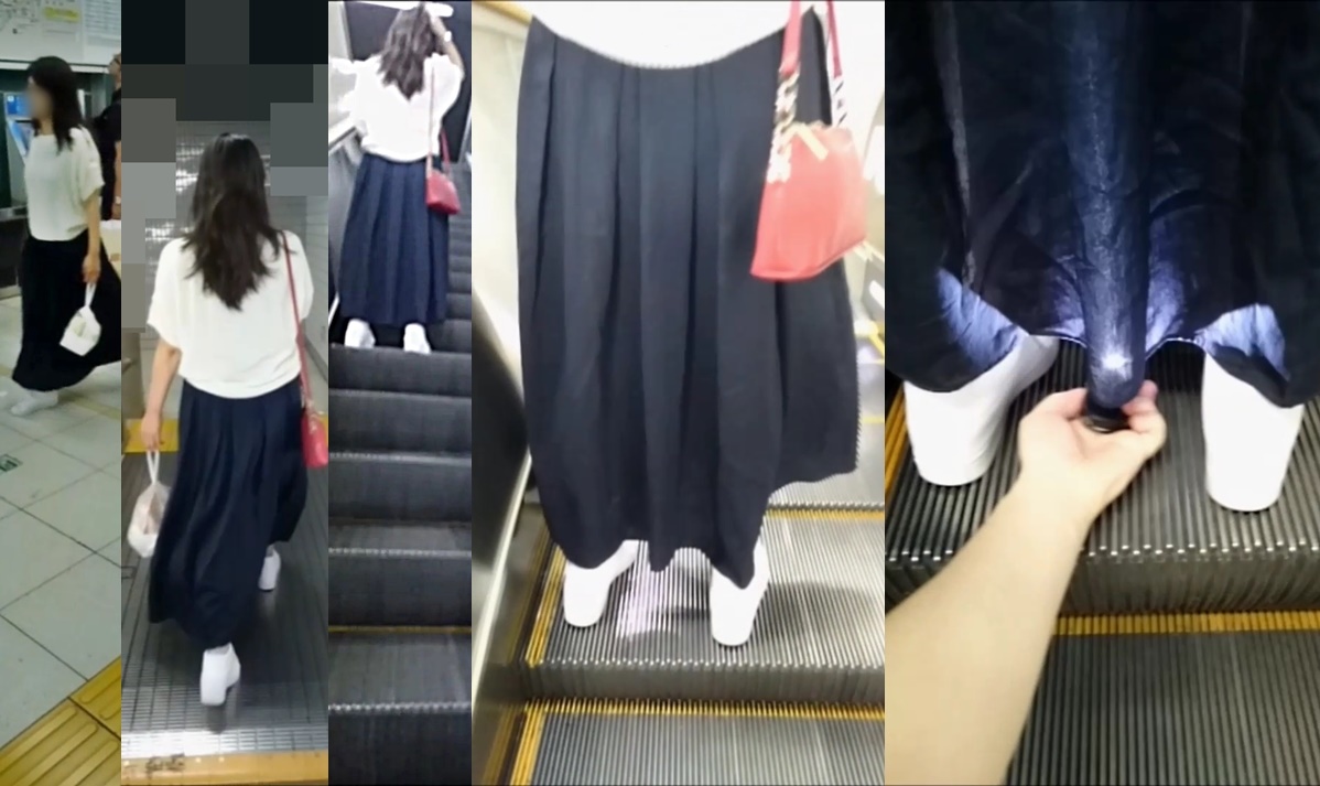 今回もエスカでのスカート逆さ撮りですが、一人はデニムのタイトロング、一人は足首までの超ロングのフレアスカートです。